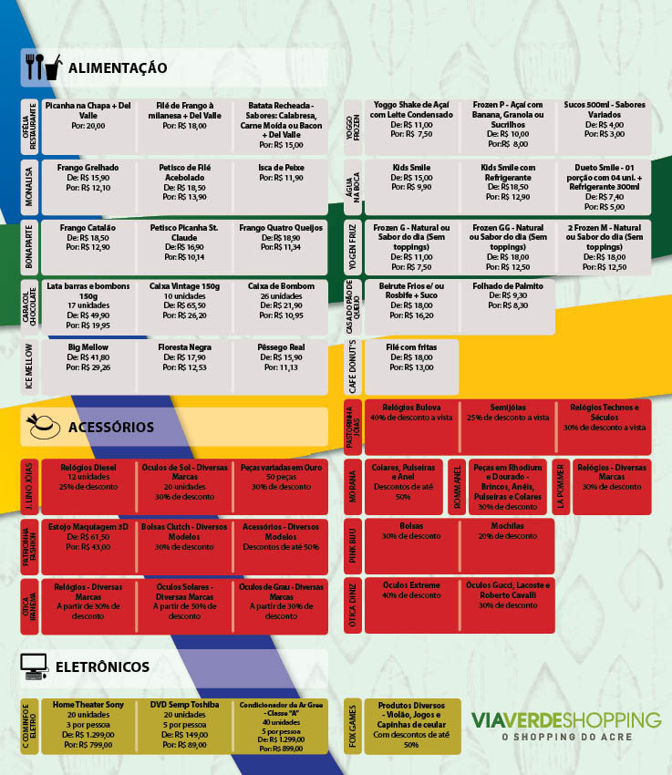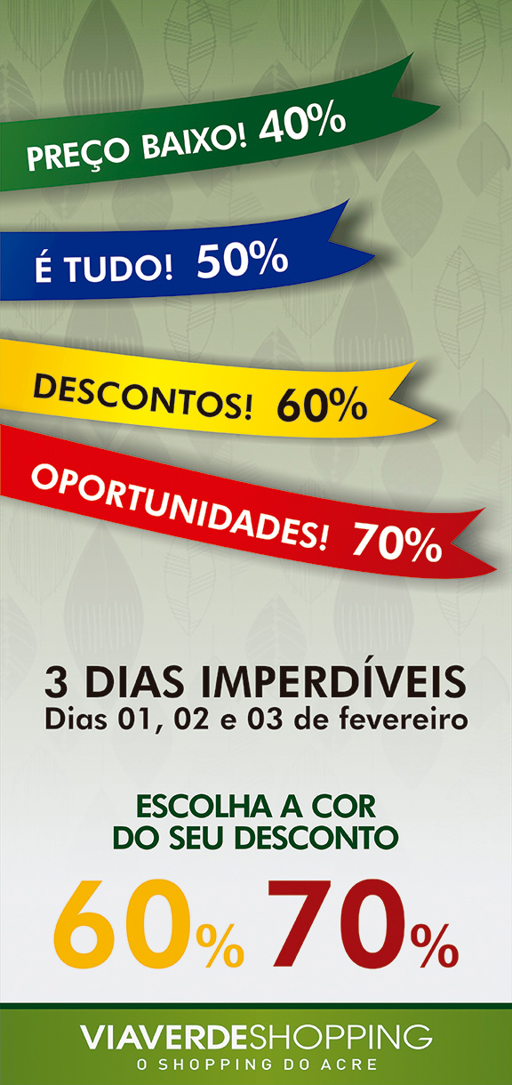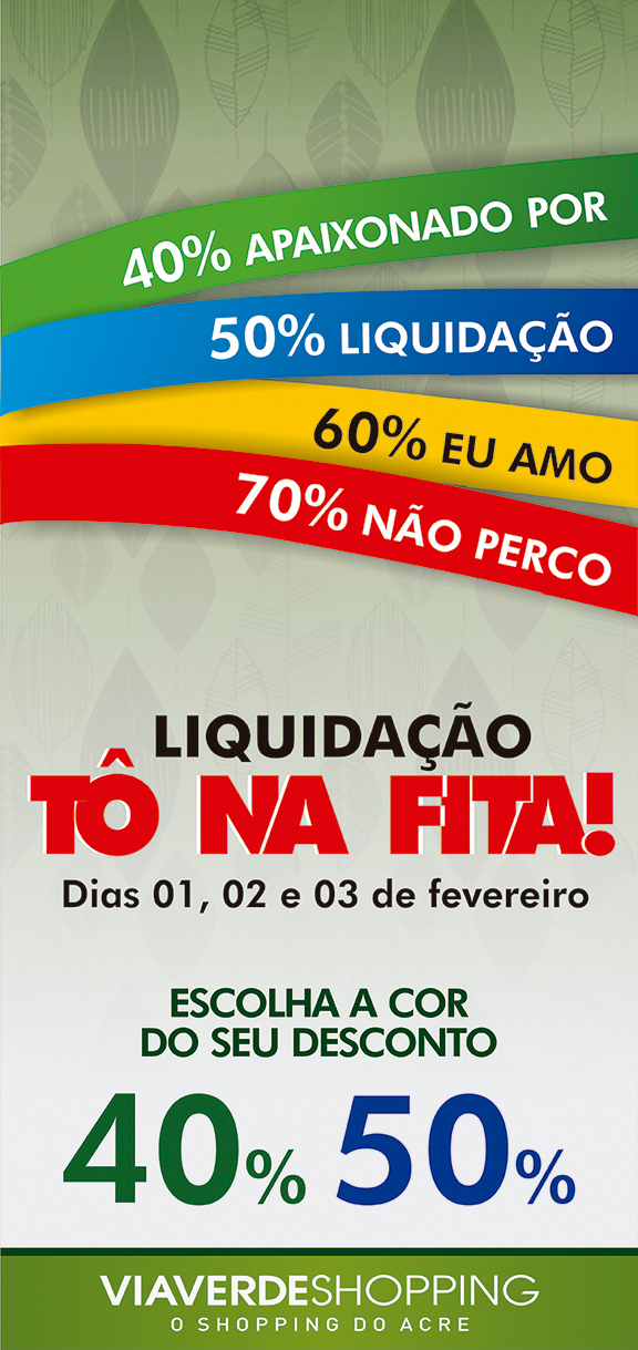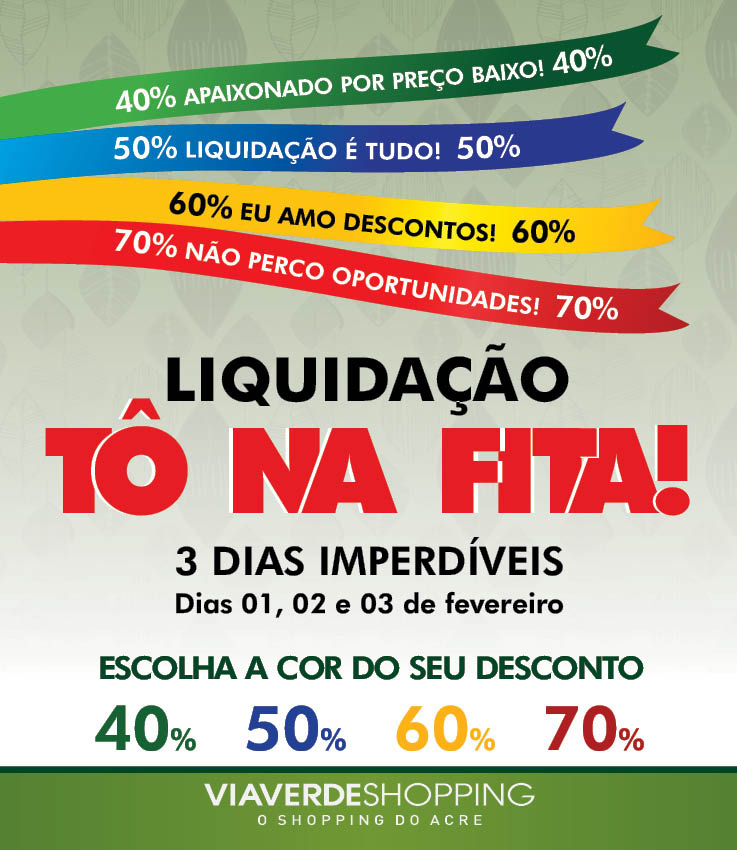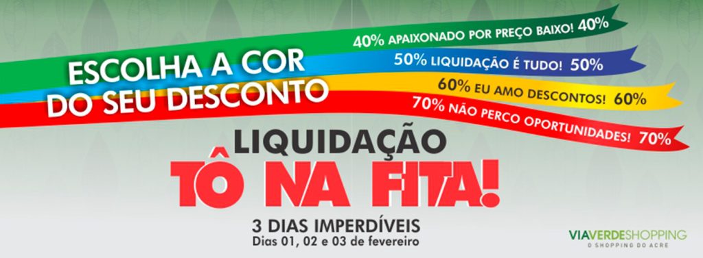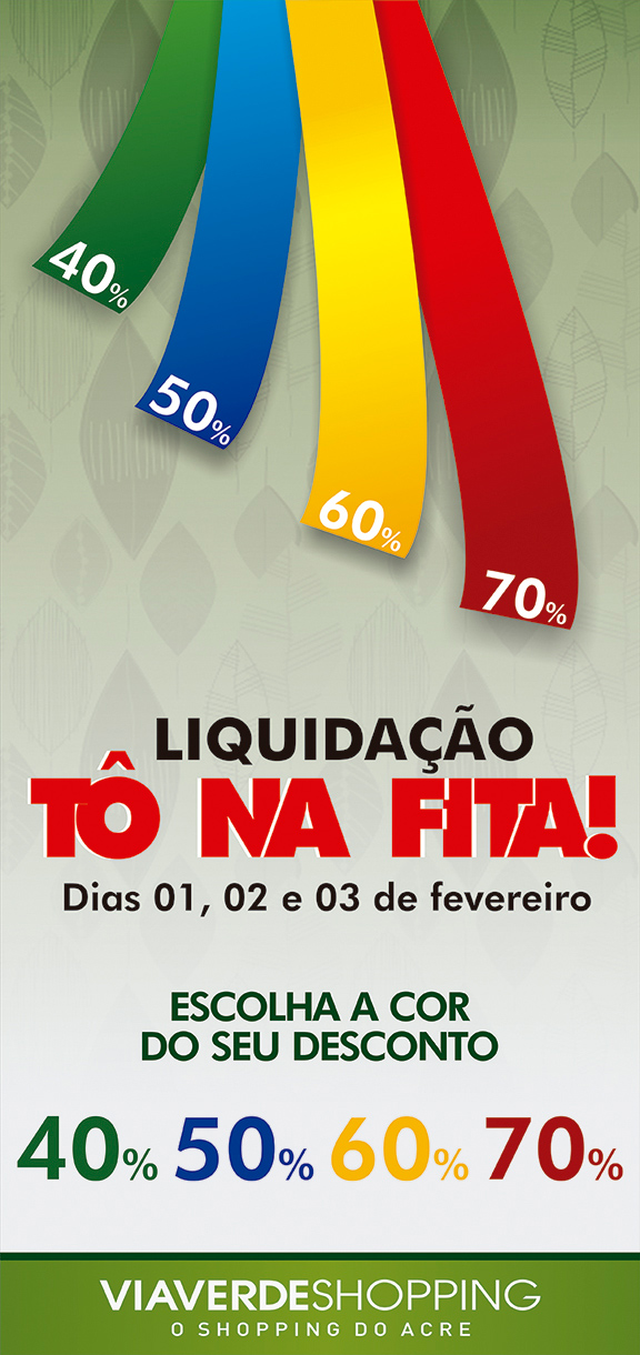 A liquidação Tô na Fita funciona assim: nas vitrines das lojas participantes estarão estampadas fitas de diversas cores: a verde oferece 40% de desconto, a azul 50%, a amarela 60%, e a vermelha 70%. O VIA VERDE SHOPPING estará repleto de fitas coloridas e preços inacreditáveis. Aproveite a Liquidação Tô na Fita no VIA VERDE SHOPPING, com descontos para você e toda a família.
