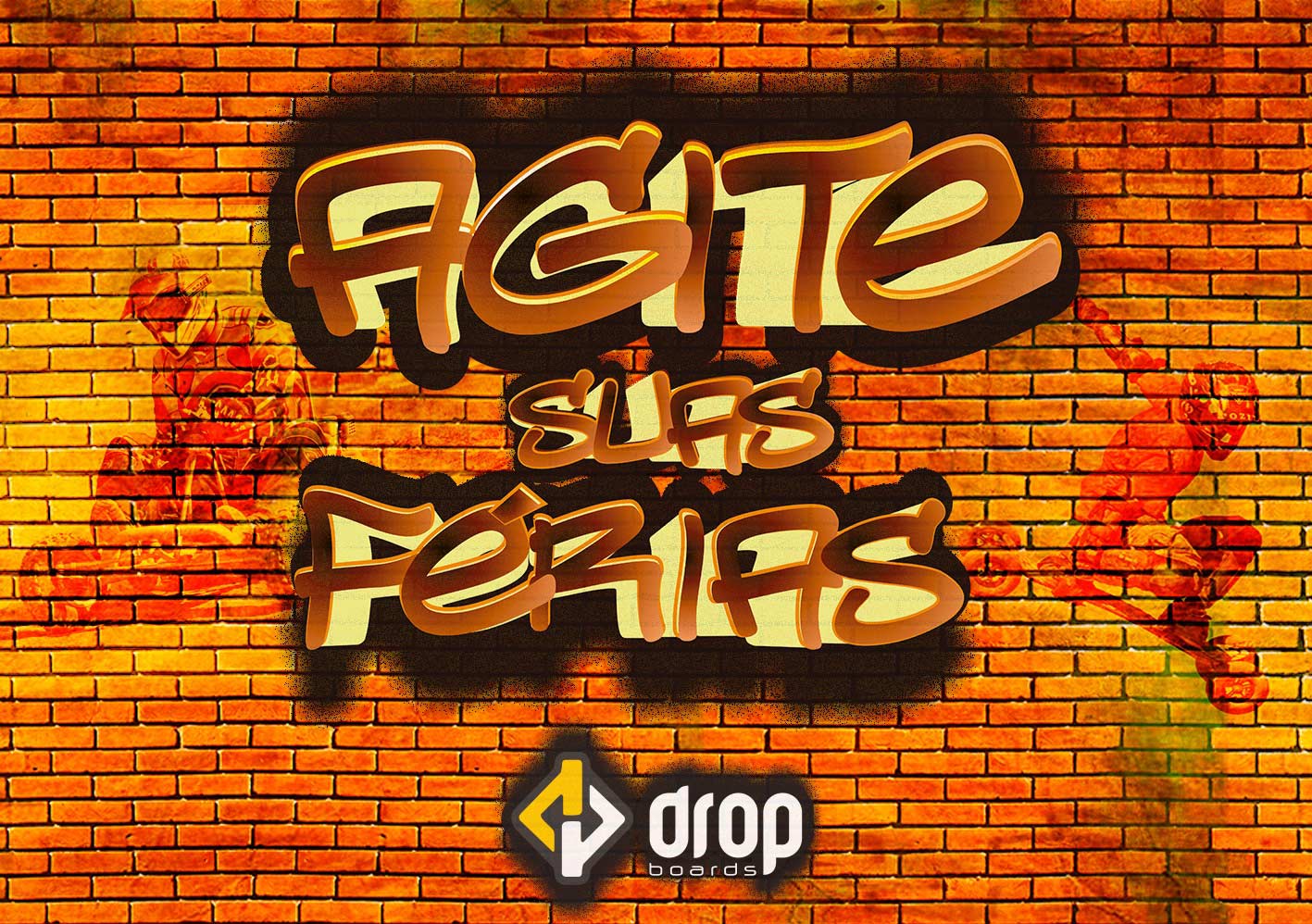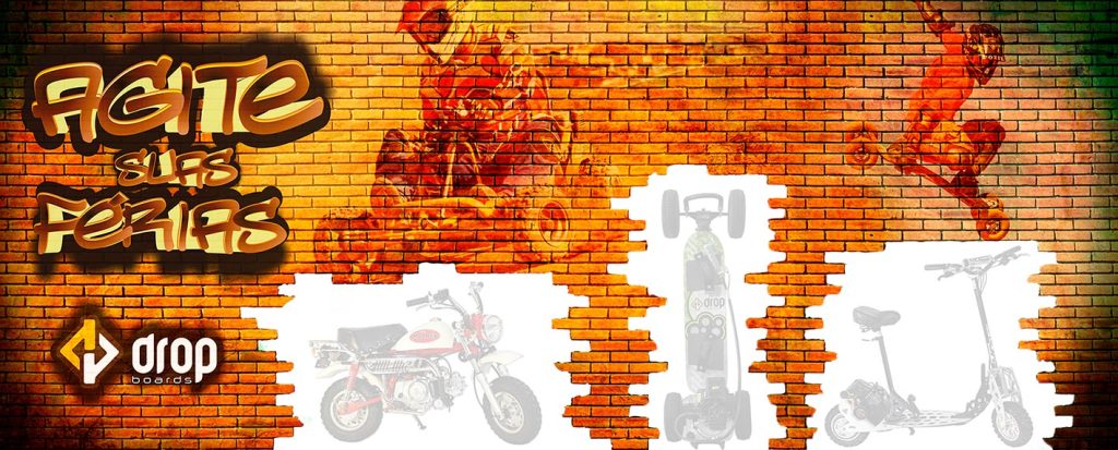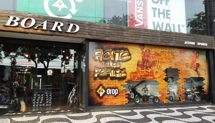 Mantendo a linha da identidade visual da Drop, criar um adesivo em grande formato, que seja expressivo, radical e chamativo; e que visto à distância comunique com o público jovem. Os produtos estarão “encaixados” na área de recorte, dando a sensação de aparecerem atravéz de uma máscara, que poderá ser um muro, induzindo a percepção visual para dentro do espaço quebrado pelos blocos. Assim, tratá destaque aos produtos motorizados, com o título/chamada “Agite suas férias!”